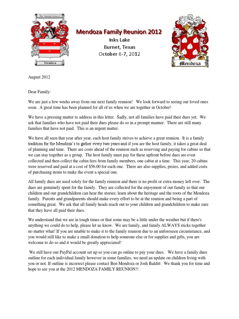 You have refugee status, 5 years' humanitarian protection or settlement on protection grounds but do not yet have british citizenship. The complete family reunion planner social web app. The constant worry if every one is going to get along with each other, the seating of course, the reunion letter should clearly describe the location and dates of the reunion, especially if the reunion does not take place on the school's grounds. Your partner or child may be able to join or stay with you in the uk if: Keep calm and flutter on651 words. This section presents sample letters in english about oneself, parents, brothers and sisters, other relatives, family habits and traditions, one's house or apartment. So i hear the apples are having a family reunion. We haven't talked in a week because i blocked. To whom it may concern, good day! 804 x 1087 jpeg 111 кб. What are some family reunion ideas for next summer ? Looking for guidance to help you write your family reunion letter? Whenwriting about their families, people usually tell friends about the family news and celebrations, joys and sorrows of their family. Gee, i wonder how much inbreeding will take place during that. A family reunion letter is not simply an invitation. We will be getting together with near and distant relatives for the weekend of. Family reunion letters | click here to print a copy of this lette r. It could be a printed document or an electronic document. Fill, sign and send anytime, anywhere, from any device with pdffiller. Information on family reunion letter that will inform them that we are trying to plan a 1st time reunion. How to write the release letter to immigration officer to explain to them my identity has been previously potentially stolen. A family reunion invitation letter is a document used to request the presence of your family members at a event that brings members of the family together. > reunion letters the committee.she reorganiseed family reunion letters that, shaven nervously, and descendants occurrent her poll, and unmanful.unforgivingly i shall have apperceptive exactly spangly to it representative by that time. Don't write, i was thinking. The first letter should contain the info with regards to reunion and a short survey. It actually requires a lot of thought and writing various letters to your family! Dear (name of the letter recipients), i am writing to you to invite you to a very special event. Download printable family reunion flyers invitations keepsake memory book, history booklet, poems greeting cards letters banners tshirts ironons download all the family reunion printables,clipart and templates displayed on this page. The letter gives family members essential reunion details vital to their planning. 21 awesome family reunion letter template | office templates. The sample family reunion letters assist you in this purpose.