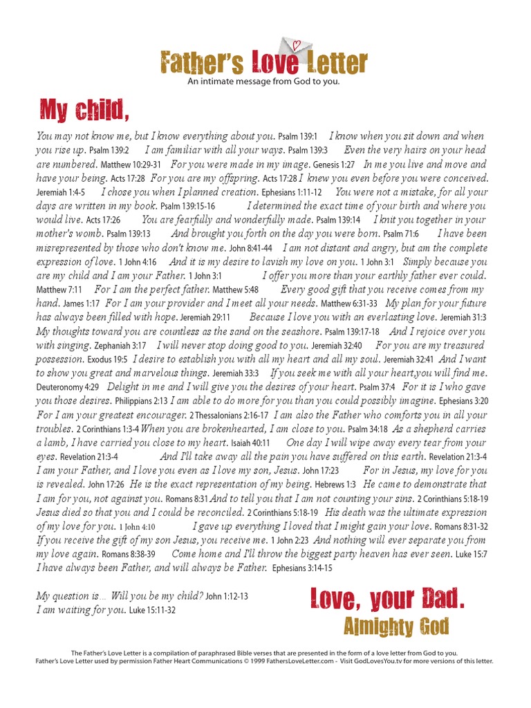 Fathers Love Letter 2014 A4 Bible Content Religious Belief And Doctrine. 5:33 a & ω productions 87 402 просмотра. Letter from god in the bible! Simply because you are my child and i am your father. In glenys' latest book, love letters from god: This made me cry a lot. I offer you more than your earthly father ever. And it is my desire to lavish my love on you. The father's love letter is an inspiring and intimate letter from god to his child. God's love letter to us. God loves us so much that he sent his son jesus to live and walk here on the earth. 5:33 a & ω productions recommended for you. 14:27 the endless love of jesus ministries. Using bible verses, this letter is a beautiful reminder of his love for us. 14:27 the endless love of jesus ministries 291 028. Letter from god in the bible!