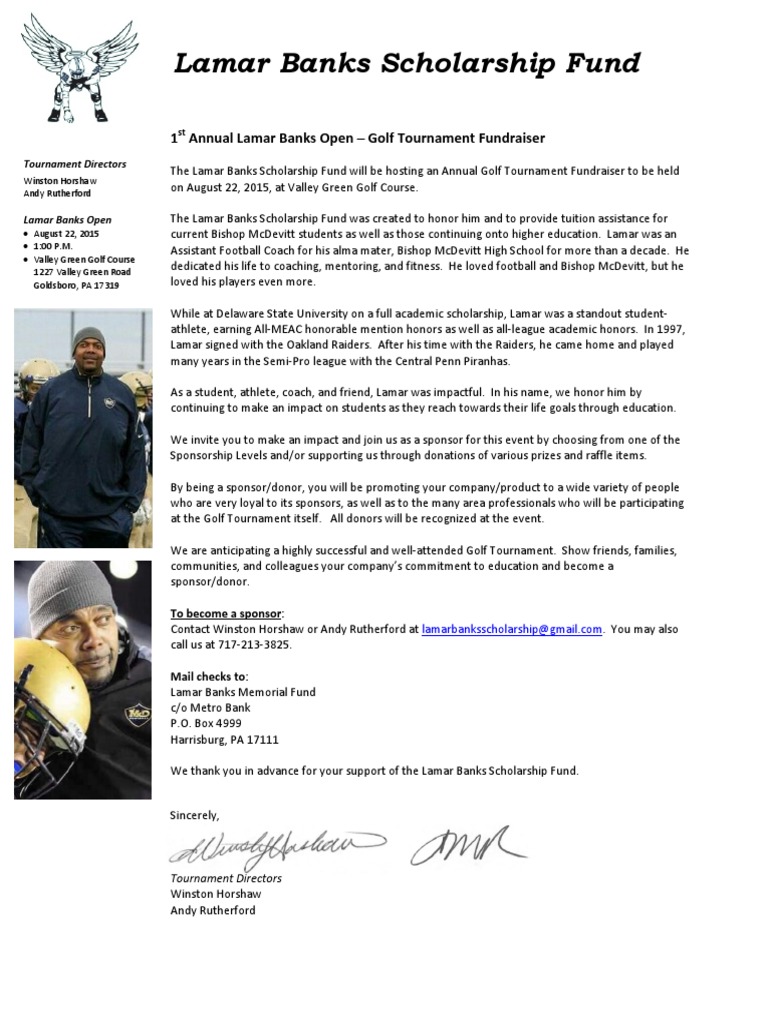 2015 Cobaa Sponsorship Request Letter. 18 personalized golf sponsor signs with stakes and free shipping. Collection of golf tournament sponsorship letter template that will flawlessly match your needs. Table of contents companies that sponsor golf tournaments how to find a sponsor for your event 2 $2500 2 foursomes, name/logo on all emails and letters. Free golf tournament planning information & resources for fundraising golf tournaments, including a budget, tournament letters, templates and more. Sponsors for your golf tournament support not only your golf fundraiser, but also the cause you're in the links below are a sponsor solicitation letter and several sample sponsorship opportunities from. Sponsors support golf so they can reach an audience important to their business. Knowing how to write an informative, inspirational and persuasive golf tournament sponsor letter is like crushing your first. $500.00 please consider sponsoring a hole in this unique charity golf. Golf outing signs, golf hole sponsor signs and golf event banners. They may also want to demonstrate corporate responsibility by supporting a charity event. Sponsorship signs can aid in your organizations fund raising goals. Maximize golf tournament sponsorship by writing an effective sponsor letter. Golf tournament signs, hole sponsor signs, golf tournament banners, hole in one signs, golf sign. This is a letter written by an individual that is sponsoring your visit to step 6:
